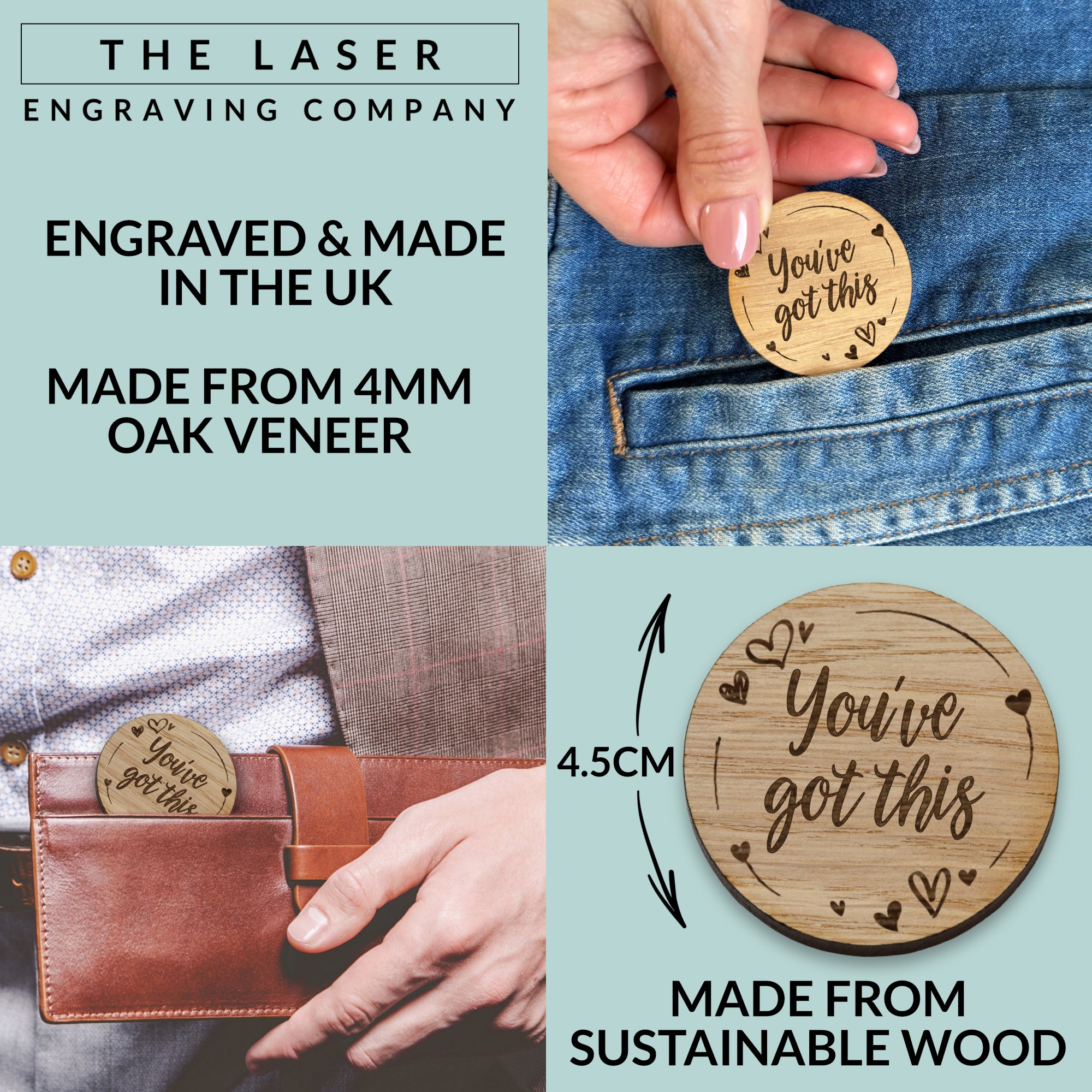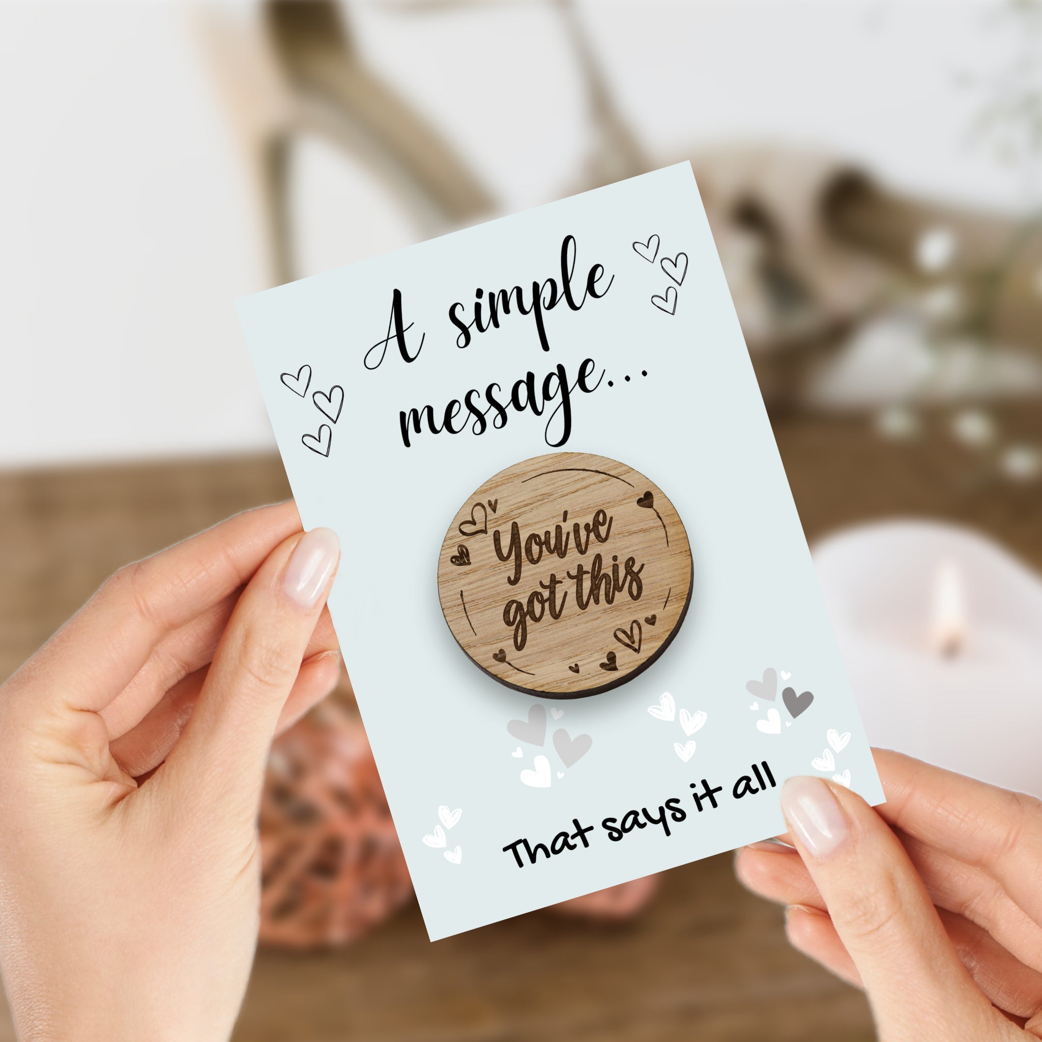 Send a little pocket sized encouragement with our ‘You’ve Got This’ wooden token and card set. Thoughtfully designed, this token offers a simple but powerful message to anyone who needs a boost of confidence and support. The wooden token is mounted on a beautifully printed card, the back has blank lines giving you space to write your own message, making this an even more meaningful gift. Perfect for slipping in a pocket, bag or wallet. Whether it’s a friend, colleague, daughter or son this little gift can brighten someone’s day.